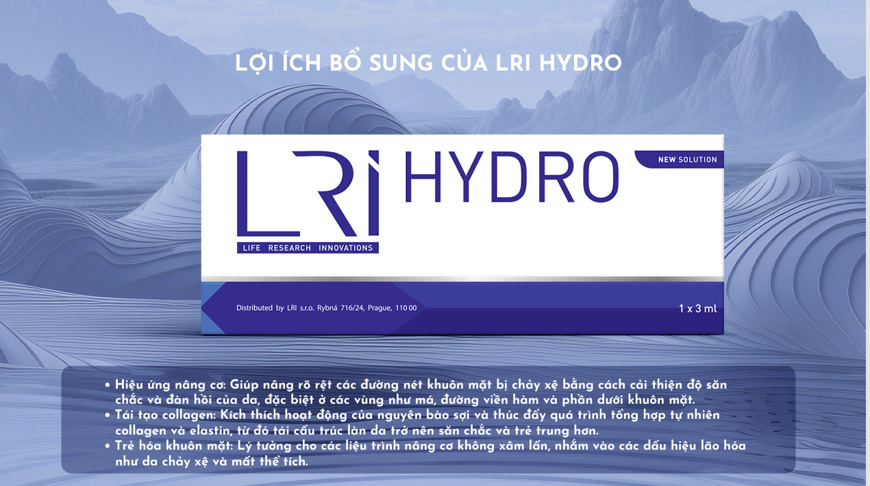 Lri Hydro là một skinbooster với các đặc tính lưu biến và độ nhớt phù hợp, được thiết kế đặc biệt để sử dụng trên các vùng da có chuyển động cao, như:  Vùng quanh má, quanh miệng, quanh mắt.